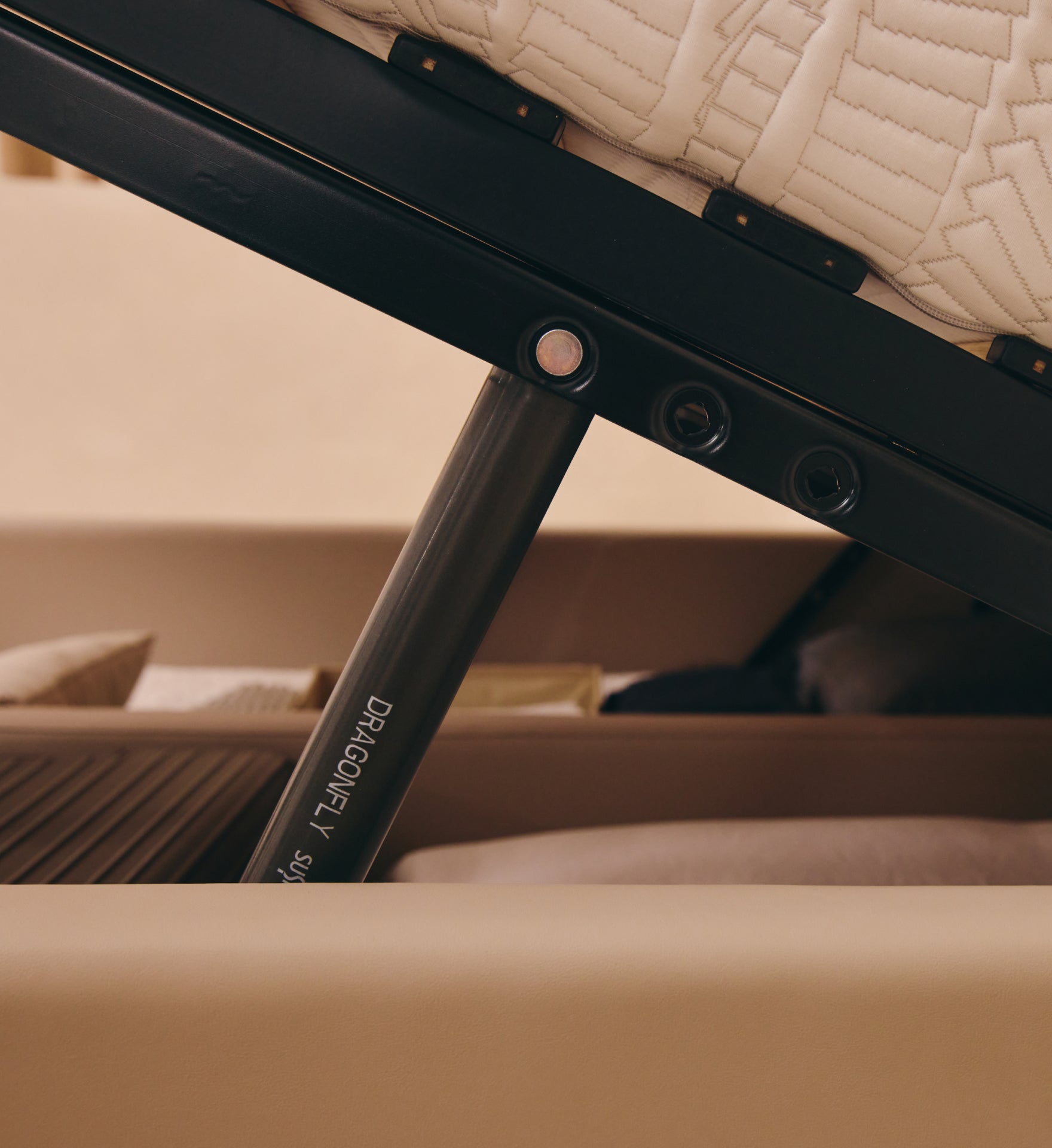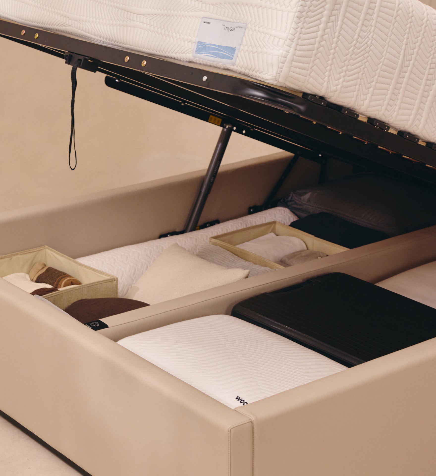 Our state-of-the-art SUSPA hydraulic system, exclusively made in Denmark, revolutionises the Storage Base experience. With just a simple tug of the latch, the base effortlessly rises, while closing is equally smooth and effortless, making accessing your storage space a breeze.